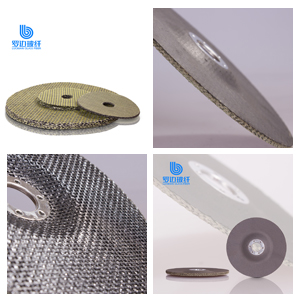 • “羅邊玻璃纖維增強砂輪網(wǎng)片 是采用玻璃纖維增強網(wǎng)布涂以酚醛、環(huán)氧改性樹脂,經(jīng)烘培后沖切而成,裁切采用外徑、內(nèi)孔一次沖切成形工藝。因此,網(wǎng)片具有尺寸公差小,同心度好,周邊光潔等優(yōu)點。該產(chǎn)品主要為不織布復(fù)合網(wǎng)片、黒紙復(fù)合網(wǎng)片和純網(wǎng)片,具有極好的耐熱性、高速切割性能及高結(jié)構(gòu)強度。“
